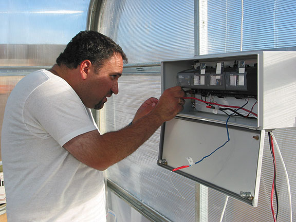 Alain Berinstain wiring up the greenhouse sensor network — Keith Cowing