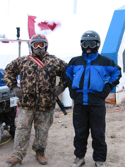 Victor Rundquist (L) and Brian Glass (R) prepare to go out on a long traverse in less than pleasant weather — Keith Cowing