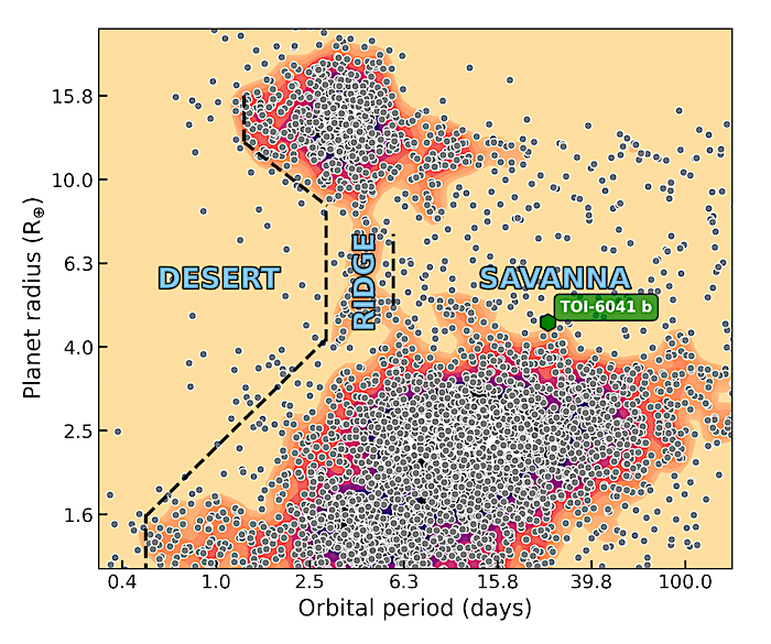 Location of TOI-6041 b within the radius–period diagram, along with other known exoplanets whose radius precision is better than 30%, taken from the NASA Exoplanet Archive (https://exoplanetarchive.ipac.caltech.edu/) as of June 5, 2025. The background density map illustrates the distribution of confirmed exoplanets, with regions labeled as the Desert, Ridge, and Savanna to reflect differing planet occurrence rates (Castro-González et al. 2024). TOI-6041 b (green marker) lies in the Savanna region. This plot was generated using the nep-des Python code (https://github.com/castro-gzlz/nep-des). — astro-ph.EP