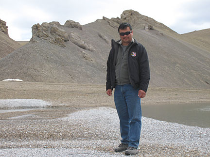 Leroy Chiao standing on breccia deposits that comprise the shore of Sapphire Lake– Keith Cowing