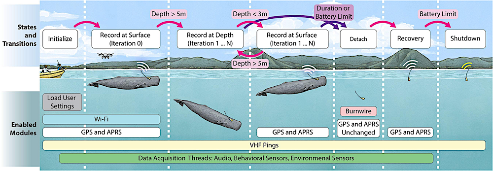 Whales can dive a mile down and stay underwater for an hour, surfacing for only a few minutes to breathe; the bio-logger is built to withstand those conditions, with battery life of about 16 hours, and audio sensitivity that picks up higher frequencies than humans can hear.