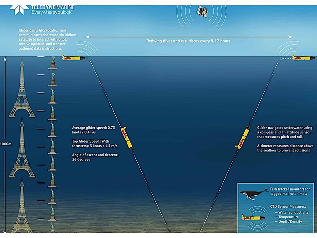 Redwing will begin its journey from the dock of the Woods Hole Oceanographic Institution (WHOI), the world’s leading independent ocean science, technology and engineering organization. Here Webb began his career and undertook work that led to the development of early gliders. Today, WHOI operates the second largest glider fleet in the world and, along with colleagues at Teledyne, Rutgers and elsewhere, uses them to conduct climate research, monitor ocean health and support protection of endangered species such as the North Atlantic right whale.