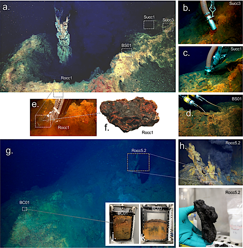 Overview of sampling locations at the Aurora Vent Field (AVF) where DNA was detected. (a) Visual of all sampling sites on the sulfide mound surrounding Hans Tore vent. (b–c) Still images of suction sampling (Succ1 and Succ3). (d) Hydraulic cylinder sampling (BS01). (e–f) Hydrothermal deposit collection (Rocc1) and the corresponding sample photographed onboard the vessel. (g) Sampling areas near Enceladus vent. (h–i) Collection and onboard image of an inactive chimney hydrothermal deposit near the Enceladus black smoker (Rocc5.2). (j–k) Shallow sediment cores collected a few meters from the Enceladus vent (BC01 and BC03). — biorxiv.org