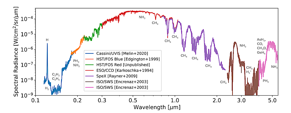 Montage of Jupiter spectra from the UV (Melin et al. 2020; Edgington et al. 1999), visible (Karkoschka 1994), and near-infrared (Rayner et al. 2009; Encrenaz 2003), adapted from Fletcher et al. (2023). Key atmospheric absorptions and emissions have been labelled. We define the spectral ranges as follows: extreme UV (50-120 nm); far-UV (121-200 nm), mid-UV (200-300 nm), near-UV (300-400 nm), visible (> 400 nm), near-IR (> 900 nm), and the start of the mid-IR at ∼ 5 µm. — astro-ph.IM