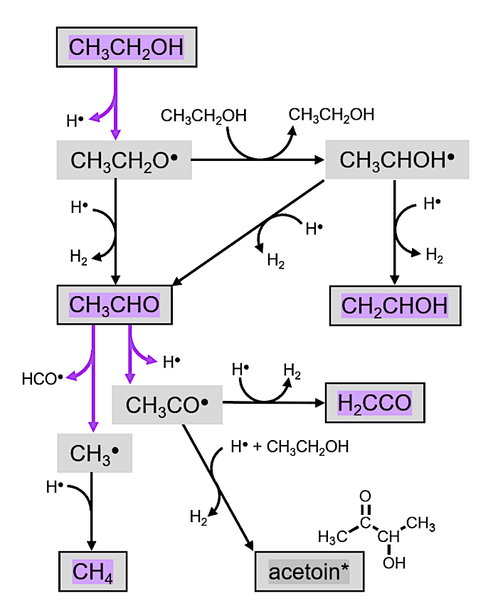Partial reaction diagram reflecting processes in the pure ethanol photolysis experiments. Purple arrows indicate processes induced by photon absorption. Highlighted species have been identified in the RAIR spectra; those with boxes around them are considered to be “stable,”, i.e., do not react further unless exposed to another reactive species. Acetoin is highlighted in gray due to the tentative nature of this assignment. — astro-ph.GA
