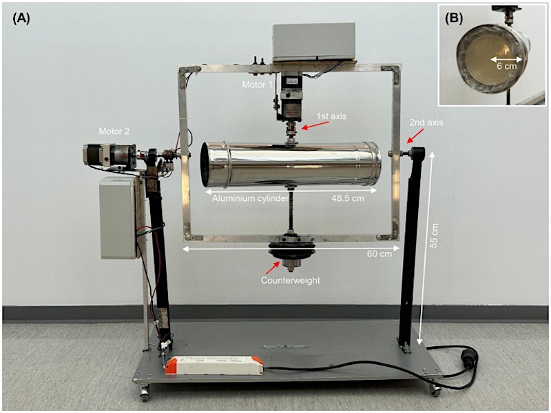Design and dimensions of the 3D-clinostat. (A) Photograph of the custom-built 3D-clinostat, consisting of an aluminum cylinder (48.5 cm long, 6 cm radius) mounted on a rectangular frame that rotates around two perpendicular axes. Two independent motors drive rotation at adjustable speeds, enabling the cylinder to traverse all orientations on a sphere and simulate microgravity conditions. Dimensions of the main components are indicated. (B) Detailed view of the cylinder’s dimensions and configuration. Up to 16 Petri dishes can be stacked inside the cylinder, and culture tubes can be inserted longitudinally along its lateral surface. — Frontiers