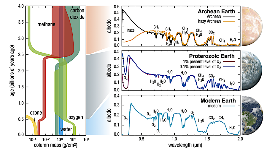 Biosignatures must be considered in the context of their environments to rule out false positives. Possible false positive planets are shown, with relevant spectral features labeled. False positives relevant to oxygenated planets are on the bottom (Phanerozoic, or modern, Earth and Proterozoic Earth); those relevant to anoxic planets (Archean Earth) are on the top. Figure by Samantha Gilbert-Janizek (UW). — astro-ph.IM