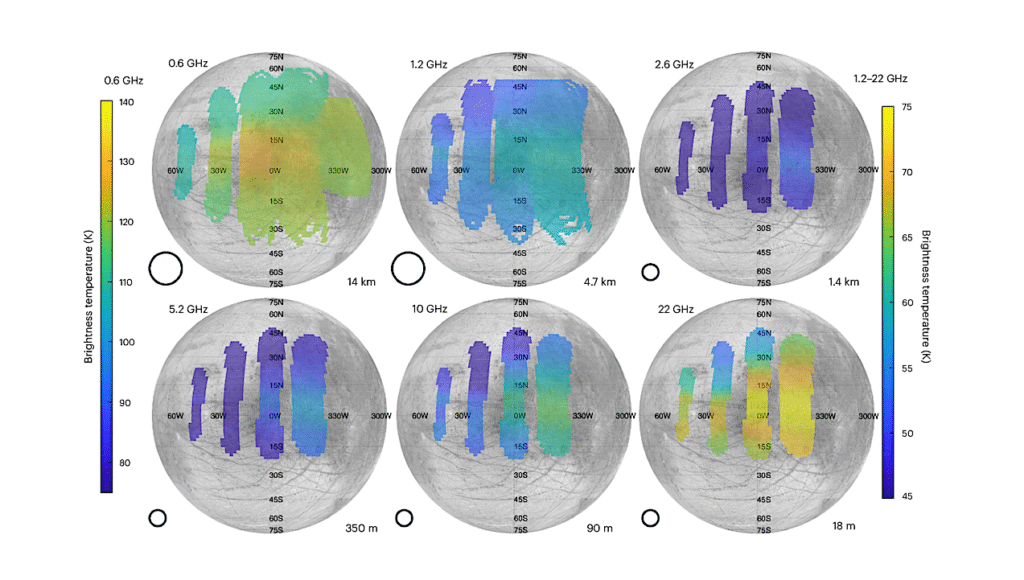 On Sept. 29, 2022, Juno came within about 220 miles (360 kilometers) of Europa’s frozen surface. During the flyby, MWR collected data on about half the moon’s surface, peering beneath the ice to measure its temperatures at various depths.