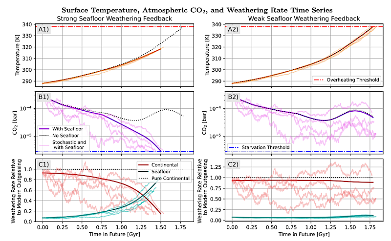 Strong seafloor weathering shortens the lifespan of the terrestrial biosphere by nearly 300 million years and shifts the biosphere kill mechanism from overheating to CO2 starvation, whereas weak seafloor weathering has little effect. Stochastic CO2 outgassing does not significantly impact results. Time series of surface temperature (A), atmospheric CO2 (B), and weathering rates (C) with a strong seafloor weathering feedback (Te,S = 9.07 K < Te,L, left column) and a weak seafloor weathering feedback (Te,S = 62 K > Te,L, right column). Results without seafloor weathering (dotted lines), without stochastic CO2 outgassing (dark colored lines), and for different realizations of stochastic CO2 outgassing (faint colored lines) are shown in each panel. Other parameter values are τ = 109 , σ = 10−4 , βS = 0.20, α = 0.075, βL = 0.41, and Te,L = 31 K. — astro-ph.EP