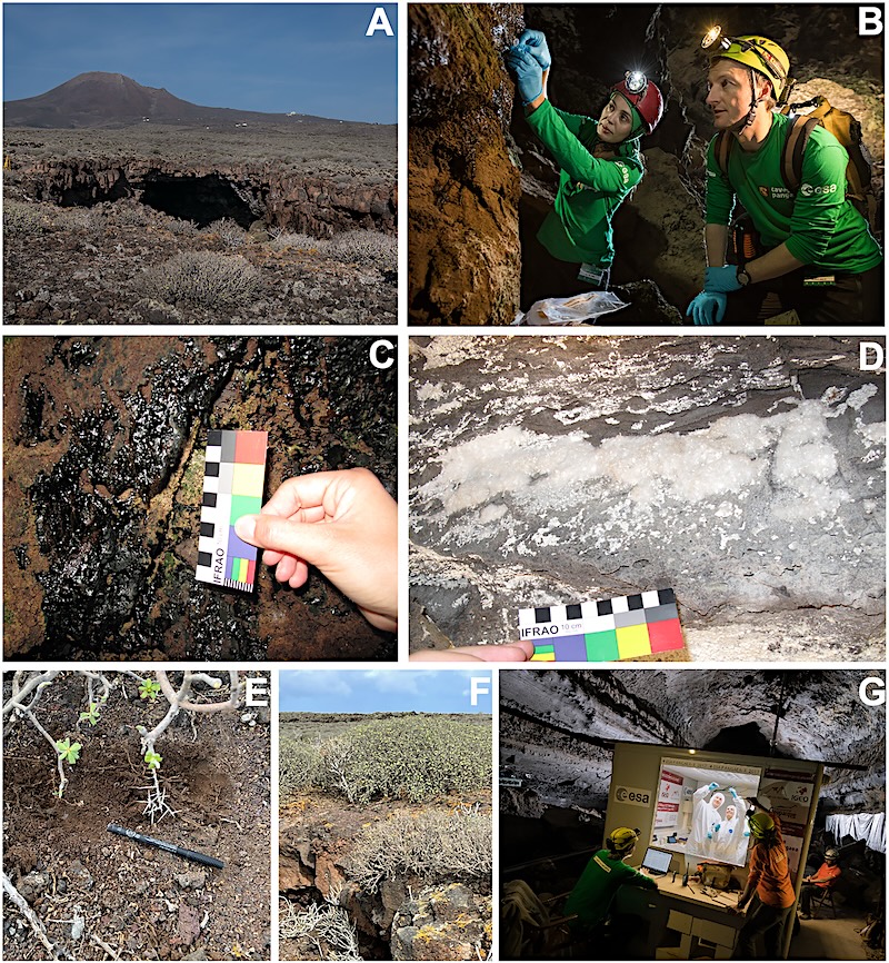 Sampling strategy in the Corona Lava Tube System during the European Space Agency’s Planetary Analogue Geological and Astrobiological Exercise for Astronauts (ESA PANGAEA-X) campaign. (A) Surface view of the Jameo de la Puerta Falsa entrance. (B) Instructional fieldwork during sample collection at site CLT1. Credit: Robbie Shone—ESA. (C) Black sticky coating (sampling site CLT1, twilight zone; scale bar = 10 cm). (D) White cotton-like secondary mineral deposits on the wall–ceiling interface (sampling site CLT3, dark zone; scale bar = 10 cm). (E) Collection of topsoil (sample SCLT) directly above the lava tube entrance to compare surface and subsurface microbial communities. (F) Euphorbia balsamifera, the dominant vegetation above the cave, sampled for molecular and biogeochemical analysis (sample PCLT). (G) Geodynamic laboratory module, installed in the Corona Lava Tube by the Cabildo de Lanzarote, where real-time DNA analysis using the MinION platform was performed. Credit: Robbie Shone—ESA.