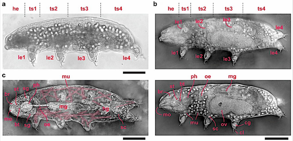 Anatomy of tardigrade visualized using holotomography. (a) Brightfield image of a tardigrade. (b) Reconstructed holotomogram at two different z-planes, with the upper panel highlighting the external morphology and the lower panel revealing internal anatomy, including the digestive tract, ovary, and others. (c) Reconstructed holotomogram illustrating musculature, highlighted in light red. Scale bar: 50 µm. Abbreviations: he, head; ts1–4, trunk segments 1–4; le1–4, legs 1–4; br—brain; st—stylet; bt—buccal tube; ph—pharynx; oe—oesophagus; mg—midgut; mg—hindgut; mo—mouth; mu—muscle; sc—storage cells; sg—saliva glands; ov—ovary; cl—claws; cg—claw glands. — Tomography, via PubMed