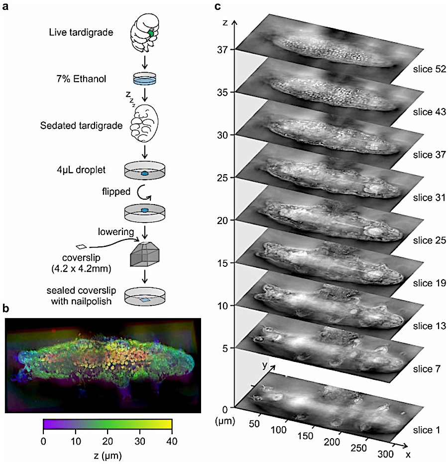 Tardigrade 3D holotomography. (a) Schematic of tardigrade preparation for holotomography imaging. Tardigrades are sedated in 7% ethanol in tap water and placed in a 4 µL droplet at the center of a 6-well plate. A 4.2 Ă— 4.2 mm coverslip is carefully positioned by lowering the plate until the droplet comes into contact with and adheres to the coverslip. The coverslip is sealed with nail polish to prevent evaporation during imaging. (b) Three-dimensional reconstruction derived from the holotomography, presented with a pseudo-gradient color scale (purple–green–yellow) to indicate image depth (0 ÎĽm–20 ÎĽm–40 ÎĽm). (c). Representative slices from the reconstructed holotomography stack, showcasing a z-resolution of 714 nm and an xy-resolution of 156 nm (Table S1).– Tomography, via PubMed