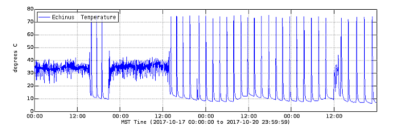 Temperature record from Echinus geyser outflow channel for October 17–20, 2017. The plot captures a time when the geyser went from occasional eruptions to semi-regular eruptions (signified by temperature spikes after about 12:00 on October 18) occurring about every 2 hours. Sources/Usage: Public Domain. View Media Details