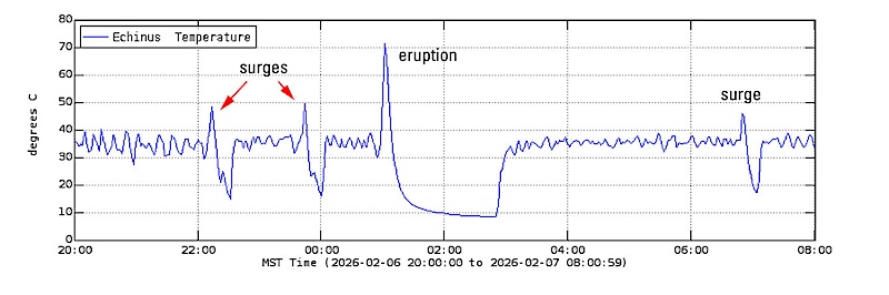 Temperature record from Echinus Geyser outflow channel for February 6, 2026, at 8 p.m. MST to February 7, 2026, at 8 a.m. MST. The plot shows initial baseline temperatures, then two spikes to 50 °C representing water surges, then an eruption marked by a spike to 70 °C followed by a lull to 10 °C, and finally a return to baseline. Another surge is present at the end of the record. The eruption shown is the first recorded at the geyser since December 2020. — Sources/Usage: Public Domain. USGS