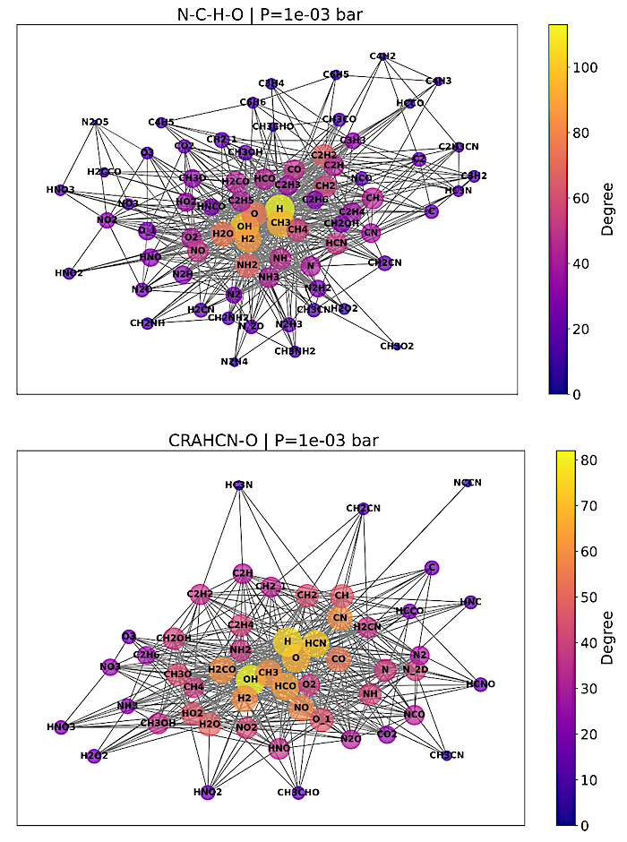 Graph networks comparing the chemical networks used in this study: N-C-H-O (top) and CRAHCN-O (bottom), for a reference pressure of 1 × 10−3 bar. Chemical species are represented as nodes, whereas reactions between species are shown as edges with their length corresponding to the inverse reaction rate. The clustering and position of species give a relative measure of their connectivity. The colour of the species relates to their degree, or the number of reaction connections to other species. The size of nodes represents the eigenvector centrality, which measures the importance of a species by taking into account the number of reactions it is involved with, the rates of these reactions, and the connections to reactive species. CRAHCN-O has an additional slow pathway from C2H4 to C2H3 , which was omitted from the plot for readability. — astro-ph.EP