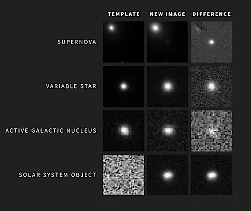 As new images are taken by the Rubin Observatory, specialized software automatically compares each one with a template image. The template image, built by combining images Rubin has previously taken of the same area in the same filter, is subtracted from the new image, leaving only the changes. Each change triggers an alert within minutes of image capture. Credit NSF–DOE Vera C. Rubin Observatory/NOIRLab/SLAC/AURA. Alert images with classifications provided by ALeRce and Lasair.