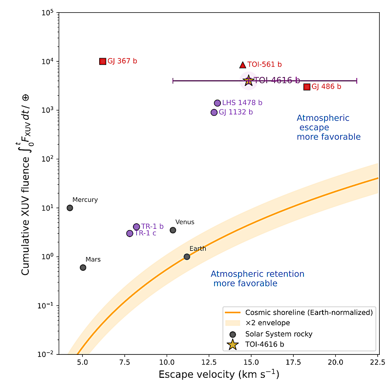 Location of TOI-4616 b in the cumulative XUV fluence–escape velocity plane, shown in the context of the empirical cosmic shoreline. The orange curve and shaded region indicate the Solar-System-derived cosmic shoreline relation (Zahnle & Catling 2017) and its uncertainty envelope, separating regimes where atmospheres are expected to be retained (below) or efficiently eroded (above). Solar System rocky planets are shown for reference. TOI-4616 b (purple star) lies well above the shoreline, in a region where atmospheric survival is nominally disfavoured, at cumulative XUV fluence comparable to or exceeding that of TOI-561 b. The location of TOI-561 b—despite recent JWST evidence for a substantial atmosphere—highlights that the cosmic shoreline is not a strict boundary and motivates TOI-4616 b as a stringent test case for atmospheric escape and survival under extreme irradiation. — astro-ph.EP